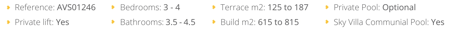 Elke Sky Villa is vervaardigd met hoogwaardige materialen en oog voor detail. Hoewel de woningen al uitzonderlijk afgewerkt worden opgeleverd, kunnen eigenaren kiezen uit een zorgvuldig geselecteerd assortiment afwerkingen om hun persoonlijke stijl te weerspiegelen. Een optioneel zwembad op het terras verhoogt het gevoel van luxe, en iedere woning beschikt over een veilige garage en privé lifttoegang, wat zowel gemak als exclusiviteit biedt.